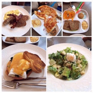 (Top left – clockwise) – Grilled sausage, bacon, scrambled eggs and French toast for Joel. Kids meal Pizza for Jah. Kids meal Meatloaf for Bella. Caesar Salad with poached egg to share. Eggs Benedict with ham and spinach for me.