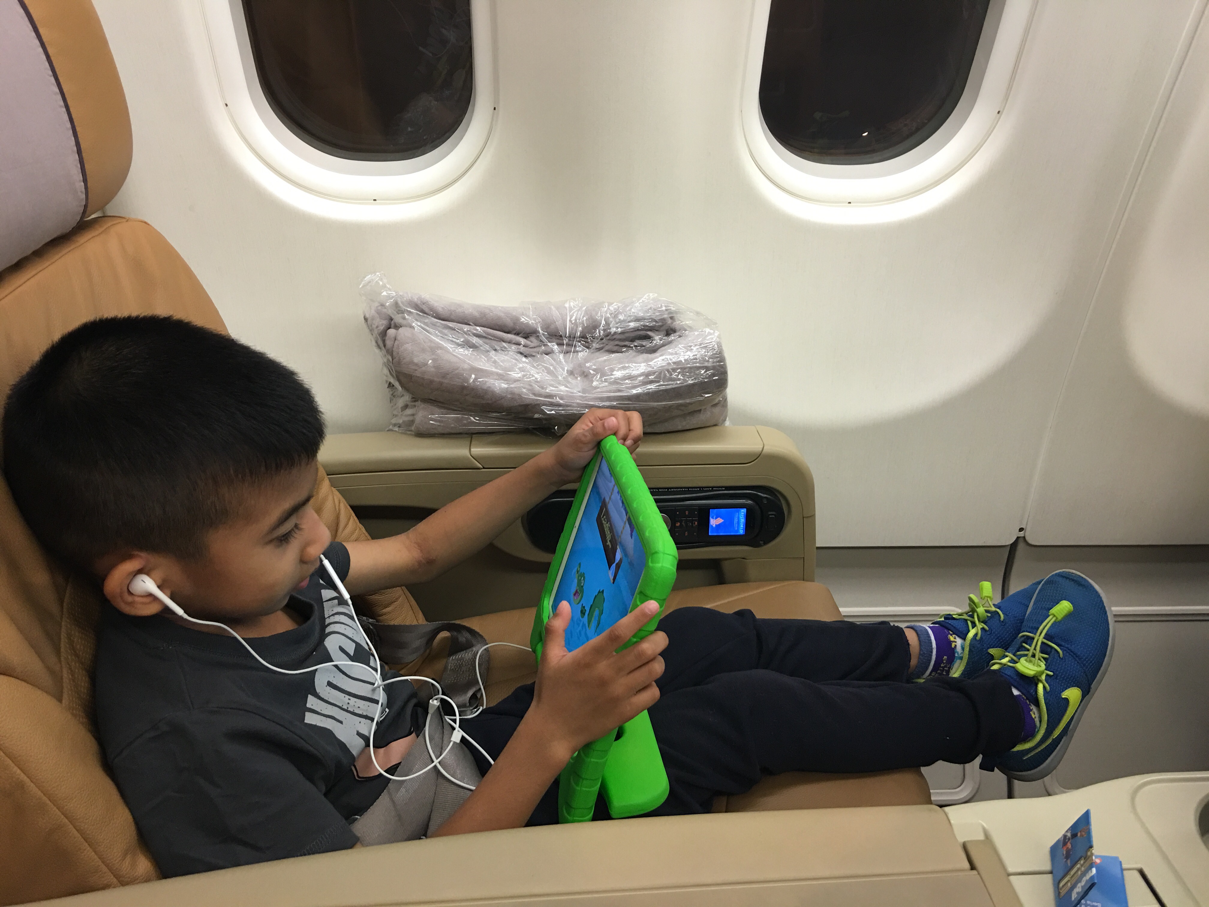Jah, on the other hand seemed determined to enjoy the ‘perks’ of his flight. He stayed up till his meal was served. Thoroughly enjoyed the starter of crossiants and fruits and then was too full for the fish congee main that was served after. He even noticed that real cutlery, China and tablecloth were used. Good spotting Jah! The boy went to sleep straight after and didn’t wake until we landed. 🙂