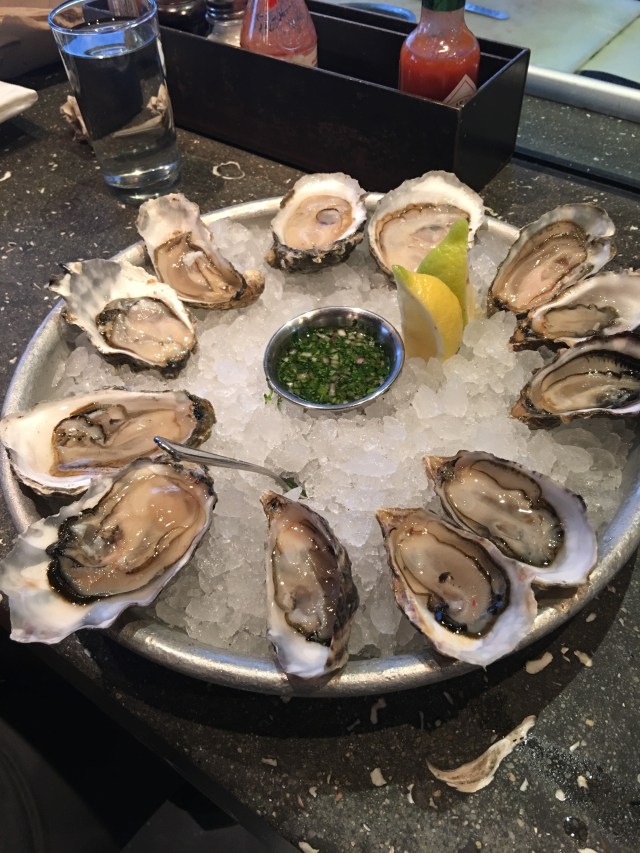 We got up at 6pm from our nap and the urge to skip dinner or have room service was almost too hard to ignore. But I persevered and dragged everyone out of bed. I even insisted that we head to the Ferry Building where the Hog Island’s Oyster Bar was located at. I don’t know what possessed me to choose that restaurant for dinner, on a Friday night of ALL nights. The kids were pretty cranky the entire way and when we saw the snaking queue we were ready to give up. It was already 730pm and it didn’t look like we would get a seat for at least another 45 mins. But for a lack of better option in the vicinity, I was unwilling to give up. So Joel very bravely brought both kids to Starbucks while I stood in line. Thankfully the queue moved pretty quickly for a table of 4 as most people were there in big groups. We were also willing to take a table at the bar which fortunately gave us a good sunset view and a view of the food being prepped π